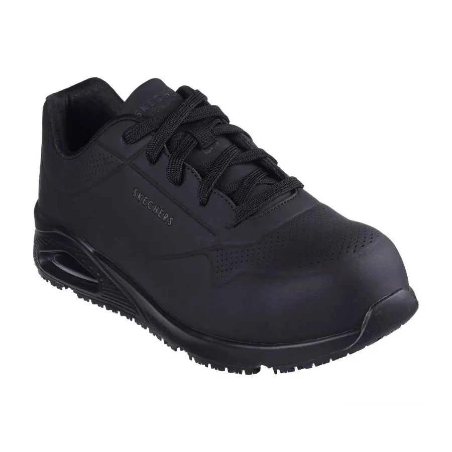 Sportos stílusú fűzős férfi munkavédelmi cipő, amely sima, szintetikus és perforált durabuck felsőrésszel, Skech-Air látható légzsákos középtalppal, szúrásálló nem fémes talpbetéttel, csúszásgátló, tapadást biztosító, olaj- és üzemanyagálló külső talppal, kompozit, nem fémből készült biztonsági orrbetéttel, elektromos statikus disszipatív (ESD) kialakítással és Skechers logóval rendelkezik.